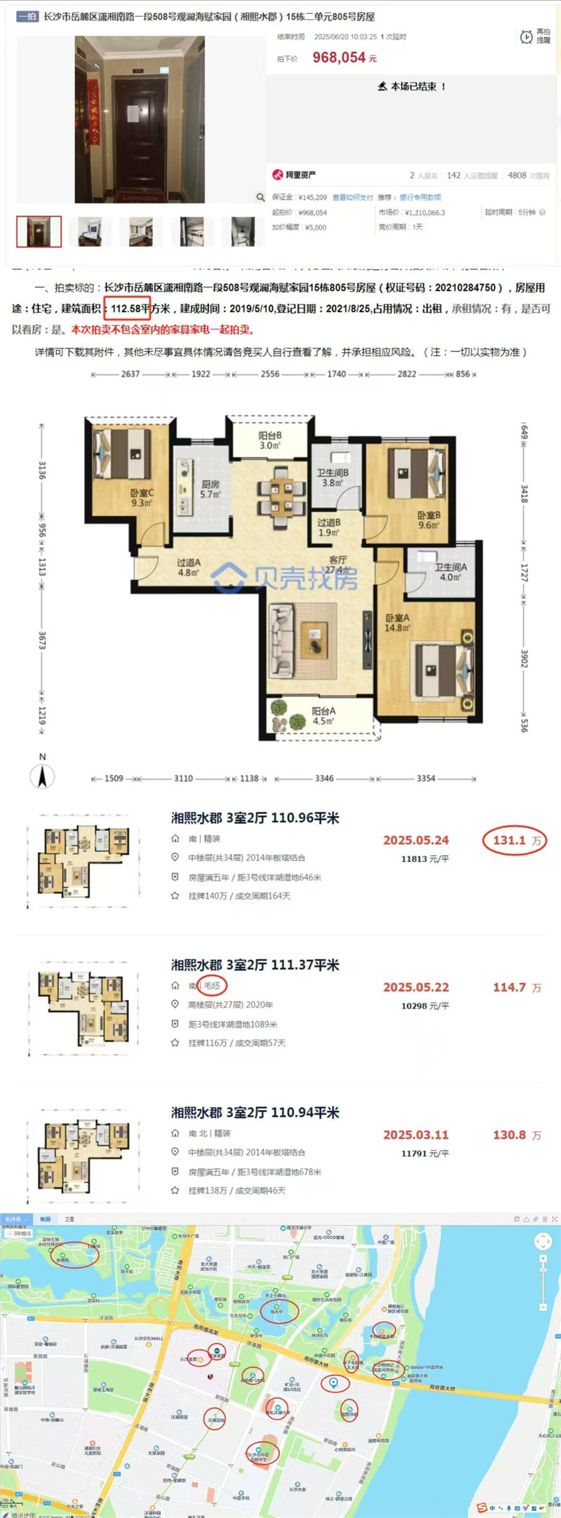 我認(rèn)為撿漏30萬左右(圖4,有貝殼二手房最近成交記錄),因?yàn)榉孔?12平,南北通透,邊戶,精裝,三房兩廳兩衛(wèi),貝殼最近的同戶型成交價都是130萬左右,而我們這套是96.8萬拍的,所以撿漏30萬左右沒有任何問題。