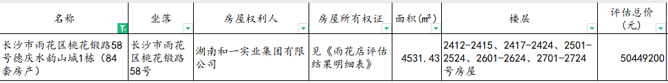 因湖南和一實業(yè)集團有限公司破產(chǎn)重整需要依法拍賣處置的相關資產(chǎn):長沙市雨花區(qū)桃花鍛路58號德慶水韻山城1棟(84套房產(chǎn)), 具體為2412-2415、2417-2424、2501-2524、2601-2624、2701-2724號房屋。以上資產(chǎn)的詳細清單及其價值請參見國眾聯(lián)資產(chǎn)評估土地房地產(chǎn)估價有限公司湖南分公司關于對湖南和一實業(yè)集團有限公司名下位于長沙市雨花區(qū)桃花鍛路58號德慶水韻山城1棟房地產(chǎn)市場價值(補充)評估說明書及相應的《評估結果明細表》。